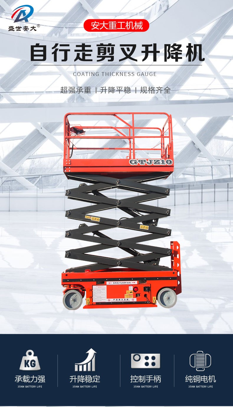 全自行式:自行式升降平臺具有自動行走功能,內(nèi)置電瓶電源,操作人員只需掌握好設(shè)備前的控制手柄就能完成前進、后退、轉(zhuǎn)向、快、慢速行走和上下等動作,自行剪叉式升降平臺移動靈活,操作方便、省工、省力令高空作業(yè)更方便快捷。